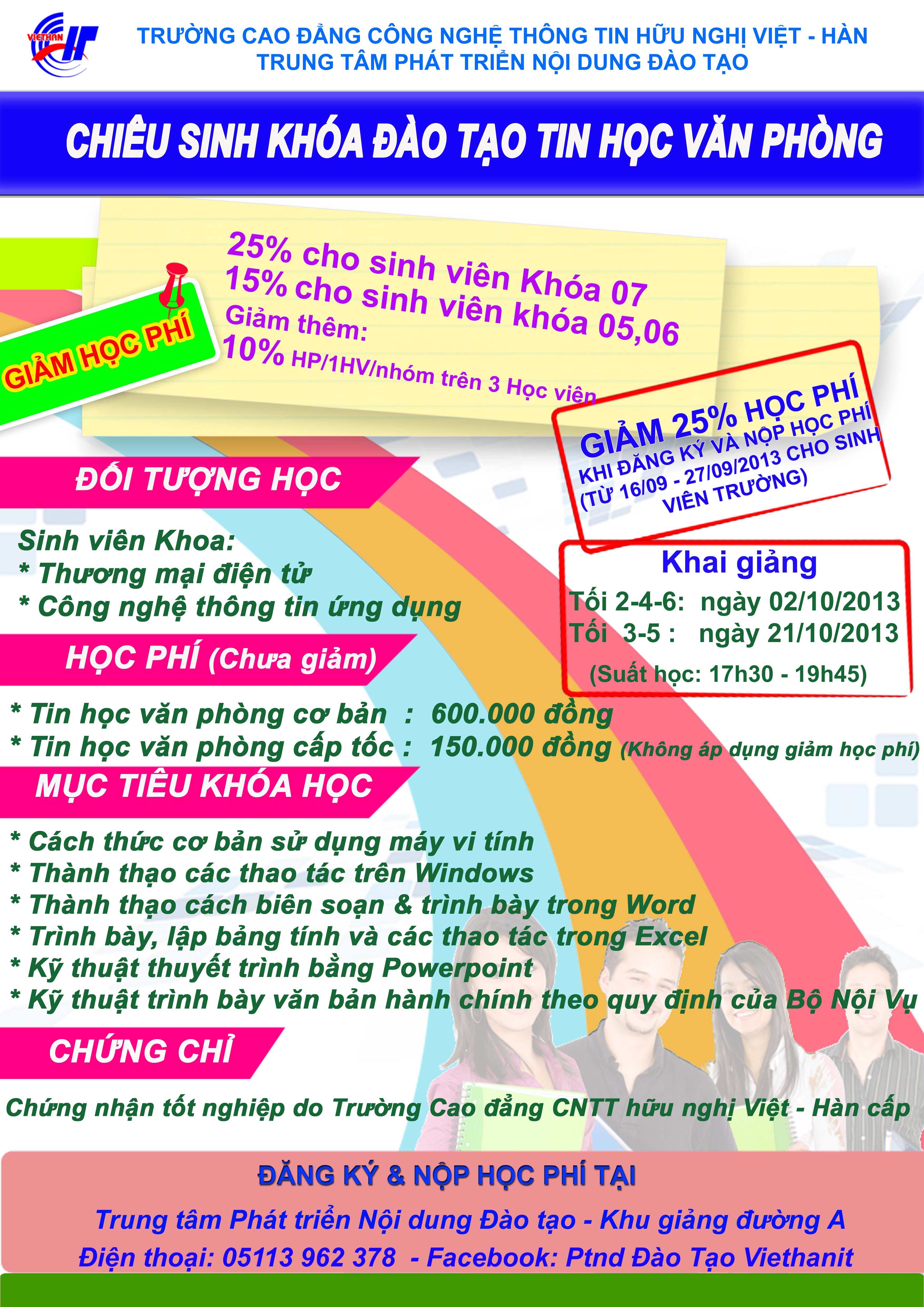 Thông báo CHIÊU SINH KHÓA HỌC TIN HỌC VĂN PHÒNG (giảm 25% học phí đến hết ngày 27/09/2013)