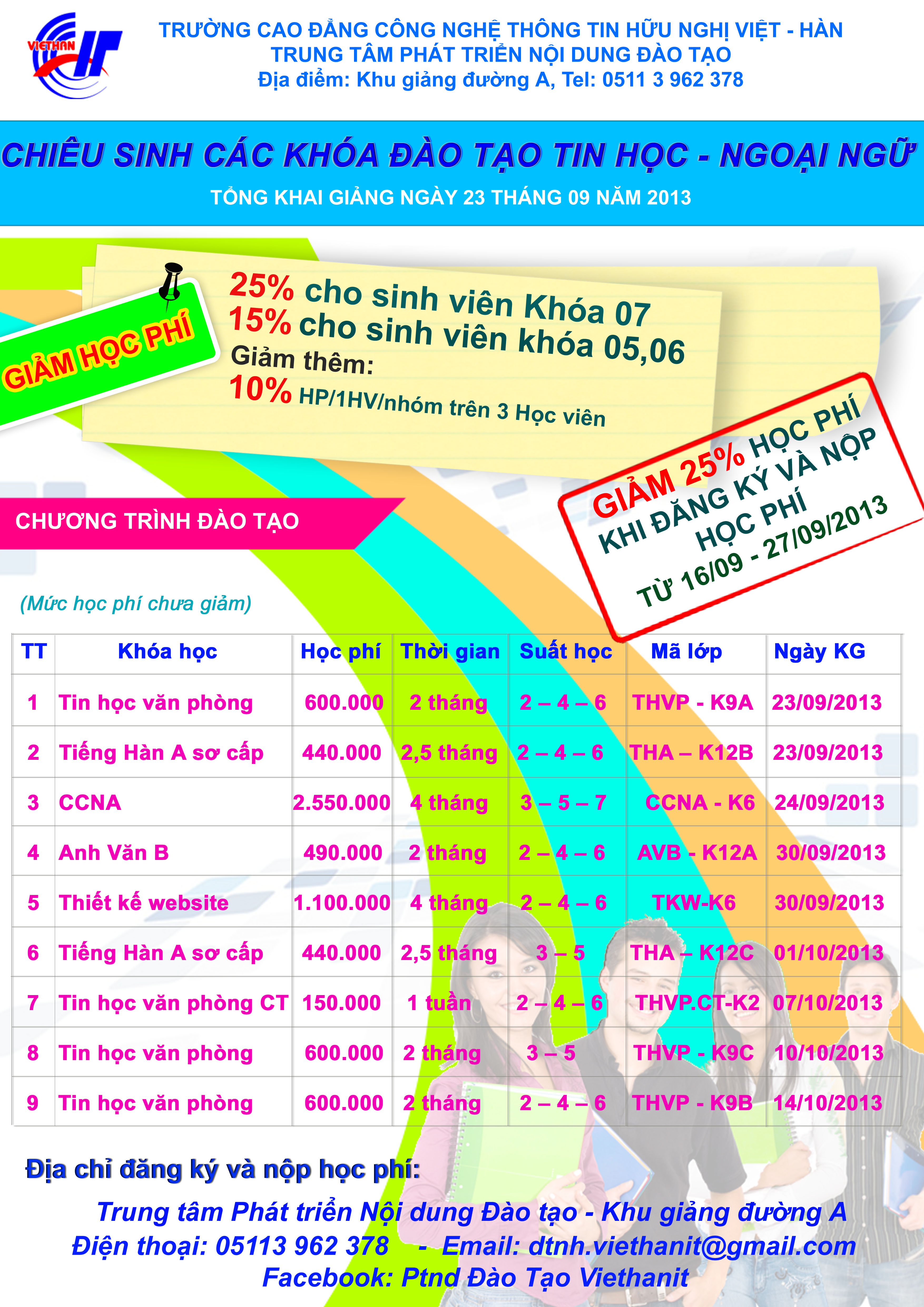 Thông báo GIẢM 25% HỌC PHÍ KHI ĐĂNG KÝ CÁC KHÓA HỌC TIN HỌC - NGOẠI NGỮ (từ 16/09 - 27/09/2013)